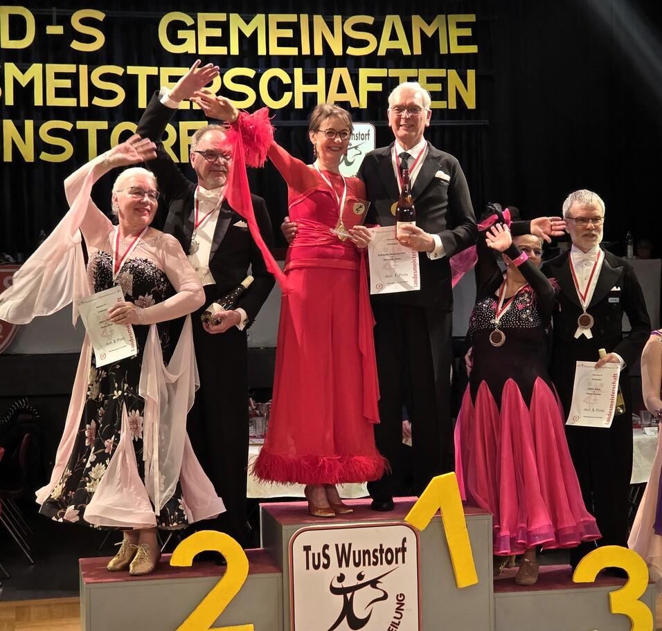 Es wurde spannend – von den sechs angetretenen Tanzpaaren aus Niedersachsen waren noch vier Paare im Finale; als auch der 4. Platz an ein anderes Paar ging, war klar, dass die beiden sich einen Platz auf dem Postest ertanzt hatten, wobei der 3. Platz an Klaus und Annette Pätow, die auch für die TSA im TSV Barsinghausen starten. Dann machte es Turnierleiter Wolfgang Rolfs, der wieder locker durch das Programm führte, sehr spannend: zwischen Platz 1 und 2 gab es einen Punktegleichstand, so dass die Skating-Tabelle zu Rate gezogen werden musste. Danach war klar: Uwe und Birgit Baars sind Vize-Landesmeister und durch die ertanzte Platzierung in die nächsthöhere Startklasse, die SEN IV A Standard, aufgestiegen. Gleich beim Überreichen der Urkunde und Medaillen fragte Frau Dr. Caroline Fried, die neue Lehrwartin des NTV, die beiden, ob sie im folgenden Turnier der IV A mittanzen wollten.