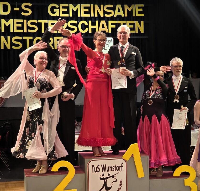 Es wurde spannend – von den sechs angetretenen Tanzpaaren aus Niedersachsen waren noch vier Paare im Finale; als auch der 4. Platz an ein anderes Paar ging, war klar, dass die beiden sich einen Platz auf dem Postest ertanzt hatten, wobei der 3. Platz an Klaus und Annette Pätow, die auch für die TSA im TSV Barsinghausen starten. Dann machte es Turnierleiter Wolfgang Rolfs, der wieder locker durch das Programm führte, sehr spannend: zwischen Platz 1 und 2 gab es einen Punktegleichstand, so dass die Skating-Tabelle zu Rate gezogen werden musste. Danach war klar: Uwe und Birgit Baars sind Vize-Landesmeister und durch die ertanzte Platzierung in die nächsthöhere Startklasse, die SEN IV A Standard, aufgestiegen. Gleich beim Überreichen der Urkunde und Medaillen fragte Frau Dr. Caroline Fried, die neue Lehrwartin des NTV, die beiden, ob sie im folgenden Turnier der IV A mittanzen wollten.