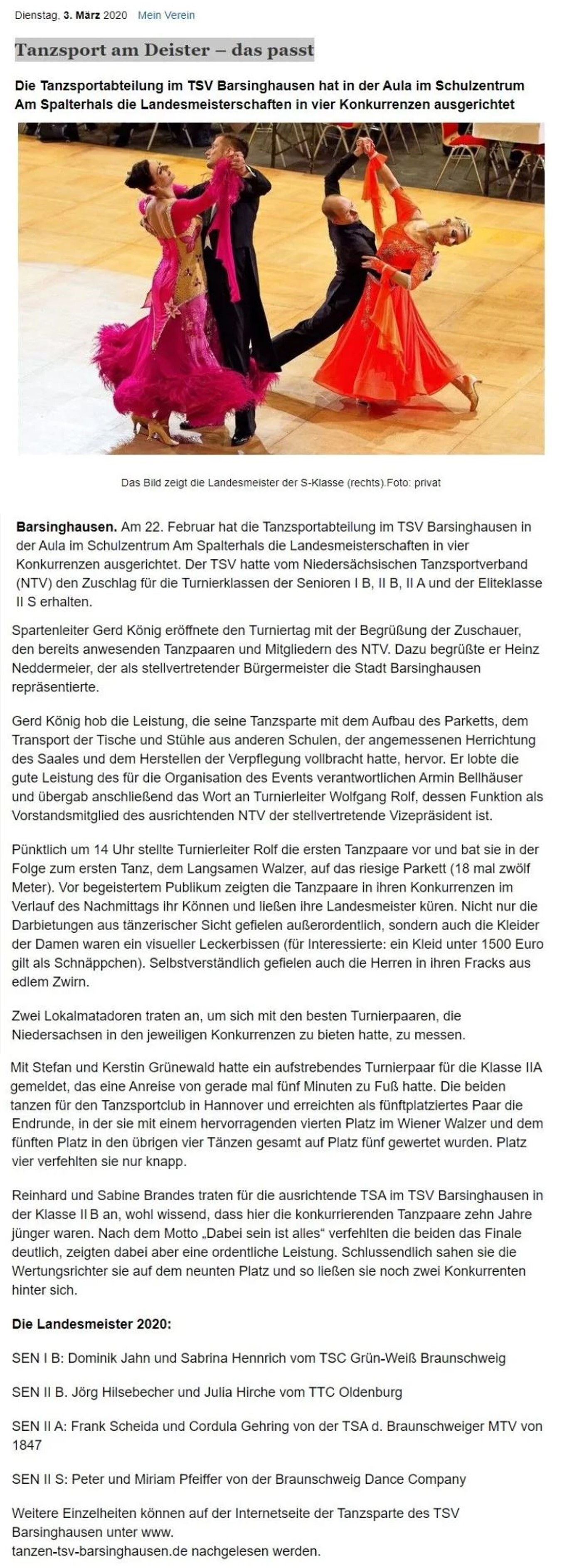 Tanzsport am Deister - das passt - TSA im TSV Barsinghausen hat im Schulzentrum Landesmeisterschaften in vier Konkurrenzen ausgerichtet