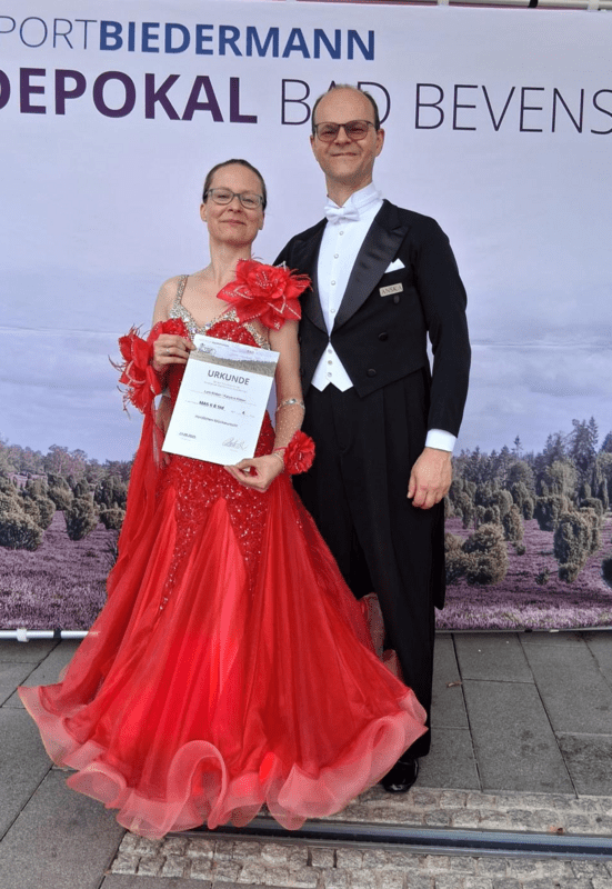 Bei schönem Wetter und mit guter Laune angereist, war aus ihrer Sicht der Samstag weniger erfolgreich; leider ausgeschieden in der Vorrunde. Am Sonntag ging es dann mit Elan noch einmal an den Start. Dieses Mal gelang ihnen der Sprung in die Zwischenrunde. Ein paar Kreuze mehr in der Wertung und es hätte für sie weitergehen können, so mussten sie sich mit Platz 9 zufriedengeben. Unter dem Strich attestierten sie ein schönes Wochenende, weil es immer wieder Spaß macht mit netten – konkurrierenden - Tanzpaaren auf die Tanzfläche zu gehen.