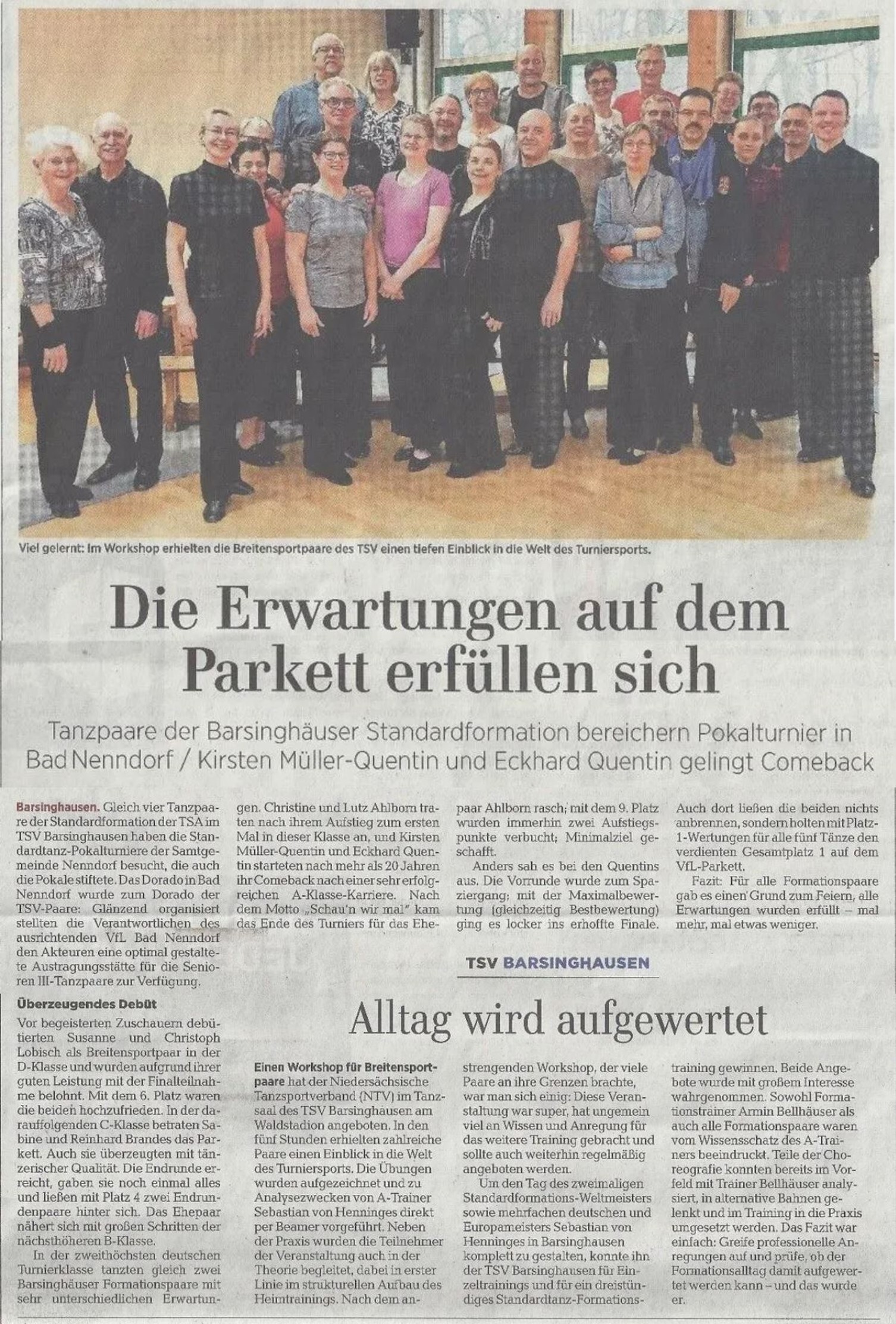 Tanz-Pokalturnier in Bad Nenndorf und das Breitensporttraining für Tanzpaare wird von der HAZ in einem großen Artikel vom 22.02.2019 unter "Mein Verein" veröffentlicht.