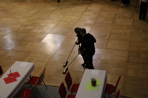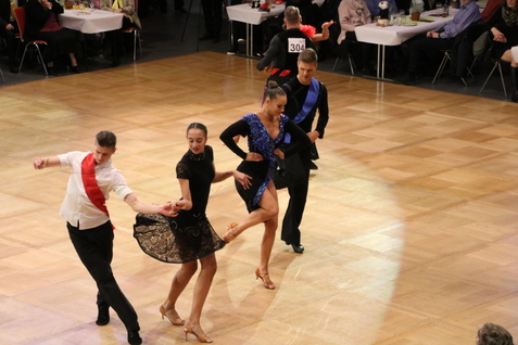 Im Wettkampf wurden jeweils zwei Paare aus den verschiedenen Teams zu Ihren Tänzen auf das eigens für diese Veranstaltung gelegte Parkett gebeten. Die WertungsrichterInnen Julia Schanz, Ariane Springer, Holger Moldenhauser, Arnd Steinhäuser und Frank Röpke hatten mit mehr als 70 Tanzrunden die Riesenaufgabe ihre Bewertungen für jedes einzelne Paar abzugeben. In der Summe der Wertungen wurden die Platzierungen für den Bronze-. Silber- und Goldplatz zum Schluss des Wettbewerbs berechnet. Standardpaare, Lateinpaare und die Boogie und Rock’n Rollpaare wechselten sich fortan auf dem Parkett ab. Das Publikum feierte die Tänzerinnen und Tänzer. Nach jeder Tanzrunde bejubelten die Teams ihre Paare und ließen die La-Ola-Welle durch ihre Reihen laufen.