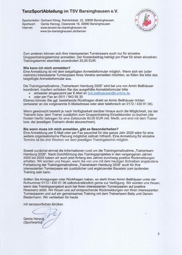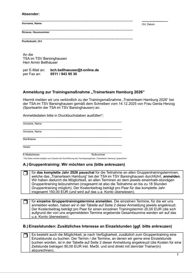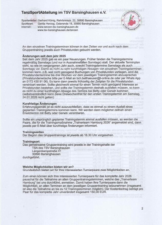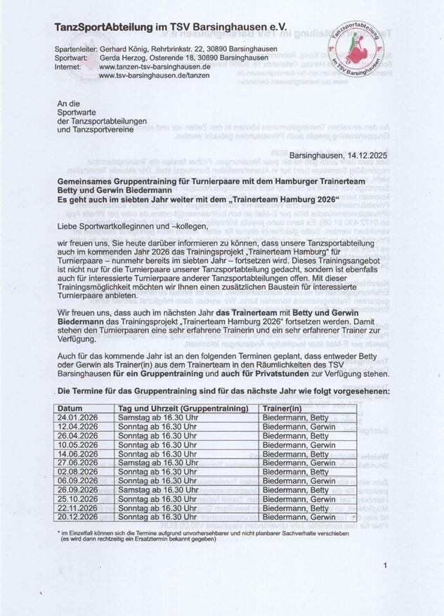 Wir würden uns freuen, wenn die geplanten Trainingstermine, insbesondere auch das Gruppentraining, möglichst zahlreich von Euch wahrgenommen werden kann. Grundsätzlich erhalten alle Paare aus unserem Verteiler die beigefügte Information für die Terminplanung 2026. Wenn wir zusätzliche Paare aus Eurem Verein oder aus Eurem Umfeld in den Verteiler aufnehmen sollen und über die Termine des Trainingsprojektes „Trainerteam Hamburg 2026“ informieren sollen, so sagt uns kurz Bescheid oder gebt uns den entsprechenden E-Mail-Kontakt auf.