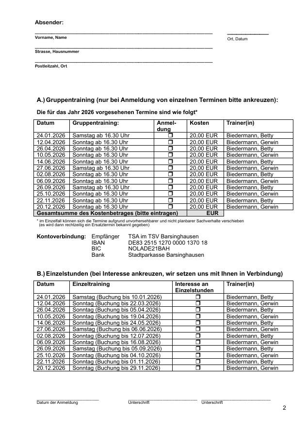 Die Anmeldung zum Gruppentraining sowie Eure Buchungswünsche für die Privatstunden schickt uns gerne per E-Mail.