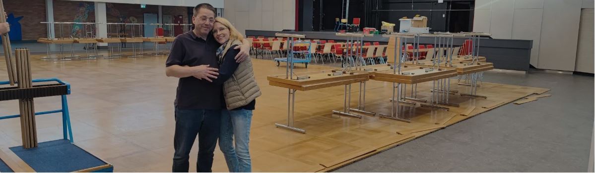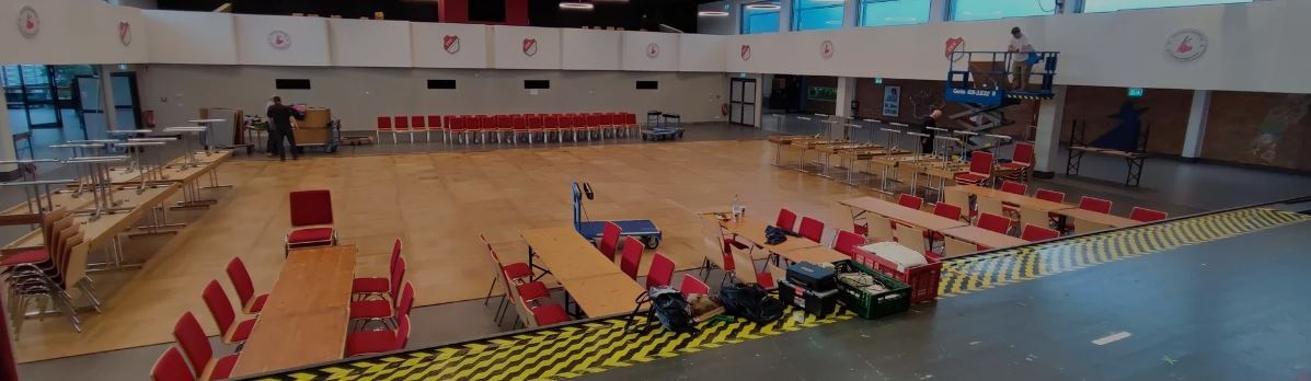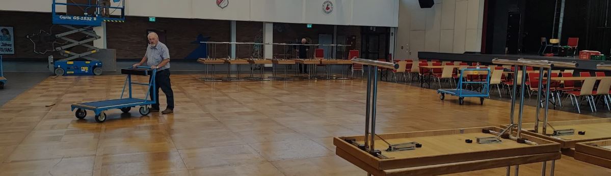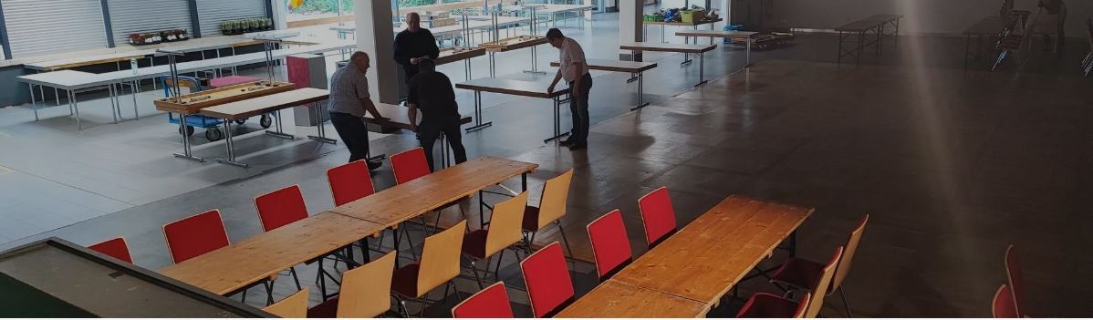 Jetzt noch die restlichen Stühle platzieren, die Tischdecken auflegen, die Tische dekorieren, die Getränke für die Turnierpaare und Zuschauer deponieren, den Helferinnen und Helfern anweisen, welche Speisen angeboten werden sollen, Begrüßungsgaben für die Turnierpaare und Wertungsricherinnen und Wertungsrichter herrichten, den Serviceplan verteilen, das Abwaschen des benutzten Geschirrs und der benutzten Gläser organisieren, die Richtungsschilder in den umliegenden Straßen anbringen und schon kann es am nächsten Morgen mit der Landesmeisterschaft losgehen. Und dabei habe ich bei meiner Beschreibung bestimmt noch eine Menge vergessen; ach ja, und abgebaut werden muss auch noch, die Tische, die Stühle, das Parkett, ... .